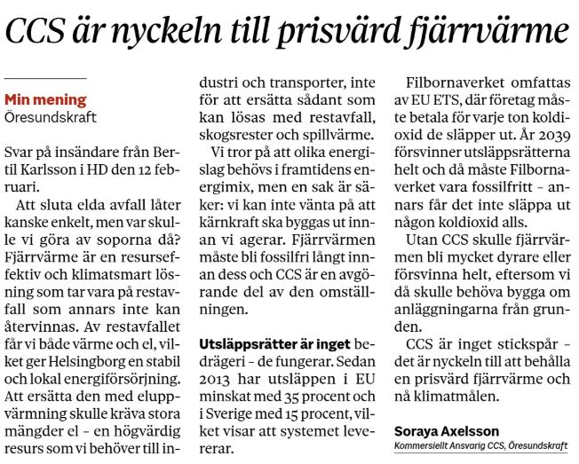 Axelsson är anställd där med uppgift att propagera för vidare kamp mot koldioxid, d.v.s. för fortsatt stöd till stolleprojekt som Fossilfritt Stål från LKAB, SSAB och Stegra, f.d. H2GreenSteel samt vätgaslagring. Alla helt meningslösa när väljarna når insikten att klimatkrisen är ett misstag. Eller en bluff.
