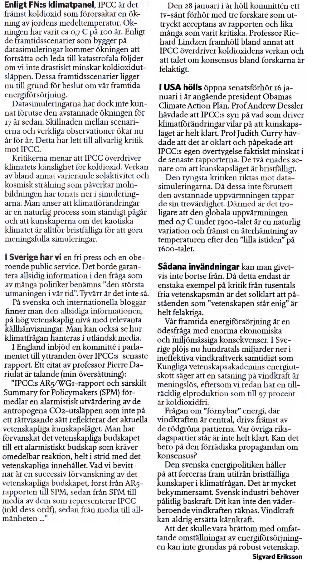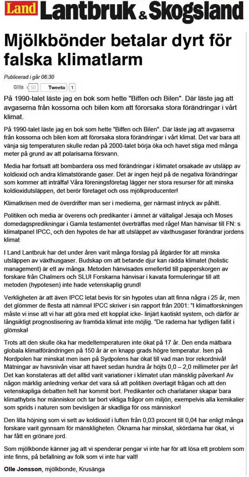 Man behöver inte vara naturvetenskapligt bildad för att följa med. Det får man hjälp med av två sidor förklaringar till begrepp och förkortningar. Han har samlat så mycket fakta, som ofta beskrivs med pedagogiska diagram, att boken blivit en veritabel upplagsbok. Förhoppningsvis kan det förbättras i en kommande upplaga med utförligare innehållsförteckning och register. Journalisten har räknat lite fel på två ställen, men det skämmer inte helheten. Han är så aktuell att han har med avslöjandet av BBC:s brottsliga censurering av skeptiker till hypotesen om koldioxidens dominerande verkan. Det avslöjandet kan ha initierat den aktuella intervjun.