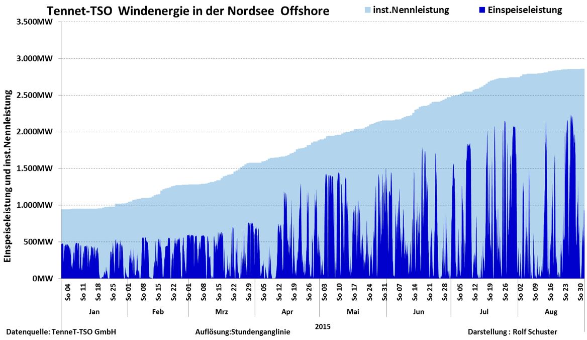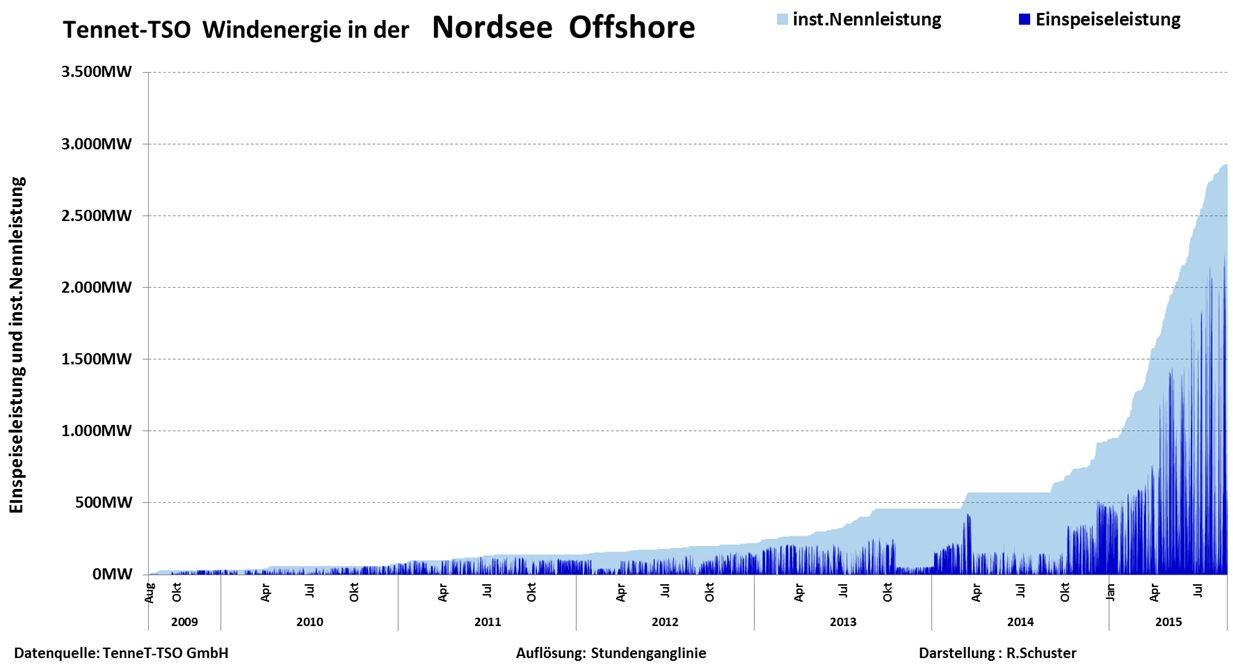 Här visas hur den tyska satsningen på Offshore vindkraft på Nordsjön växt under åren. I ljusblått visat den totala märkeffekten, som anslutits till nätet. Under 2015 har den tredubblats hittills.