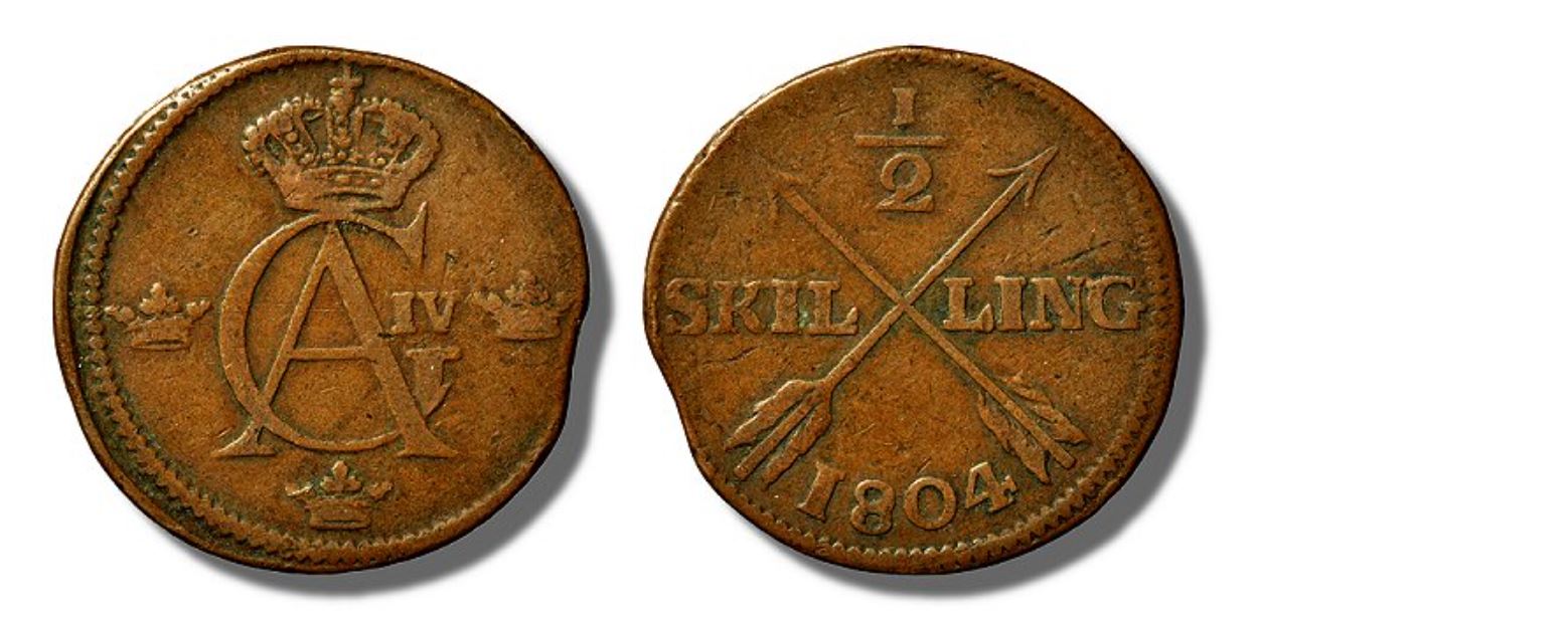 Ett mynt från den avsatte kungen Gustav IV Adolfs tid, som en påminnelse om Sveriges fattiga förflutna (foto Sonesgården).