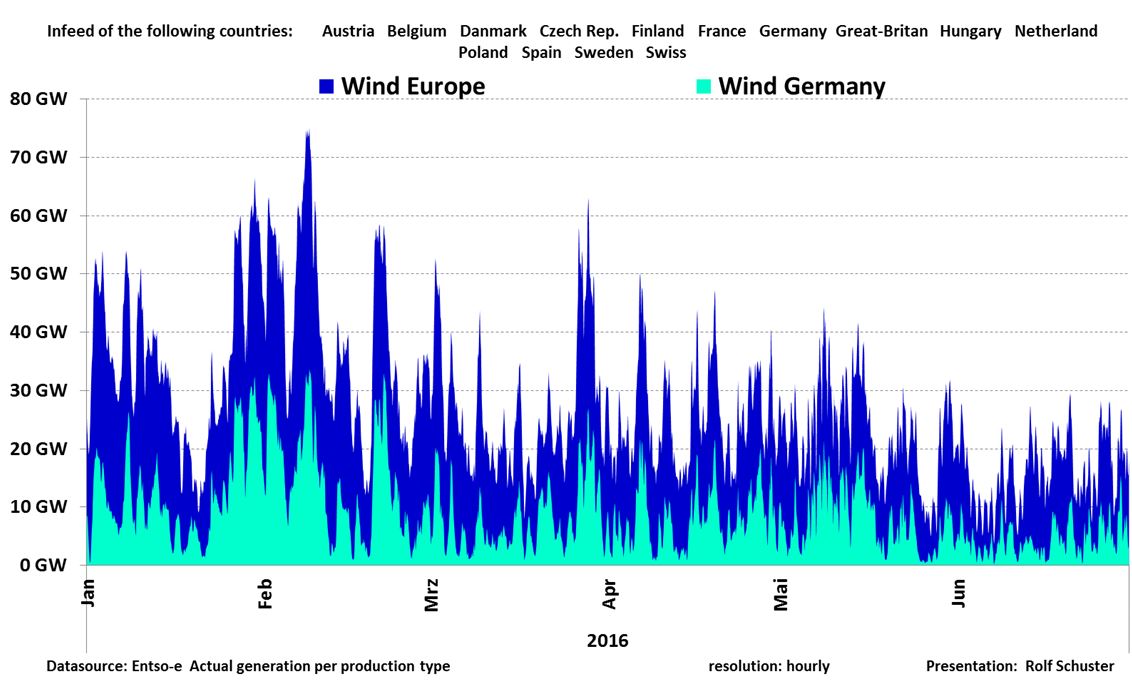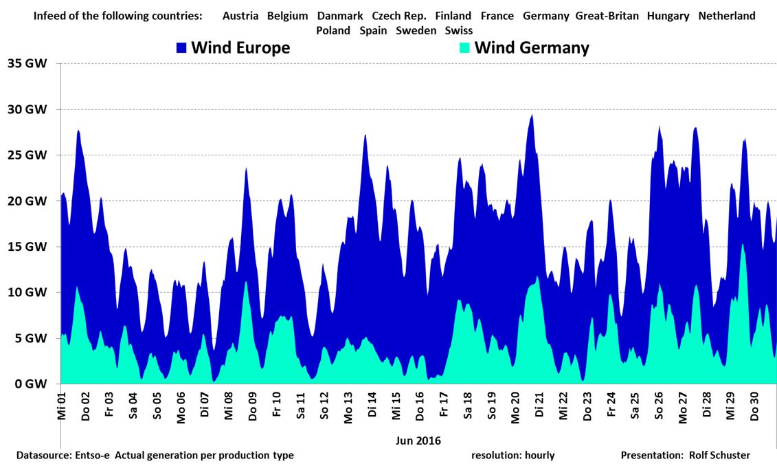 Rolf Schuster har lyckats få fram data från 14 länder i Europa inklusive dem med mest vindkraft: Tyskland, Storbritannien och Spanien. Grafen ovan avser juni 2016.