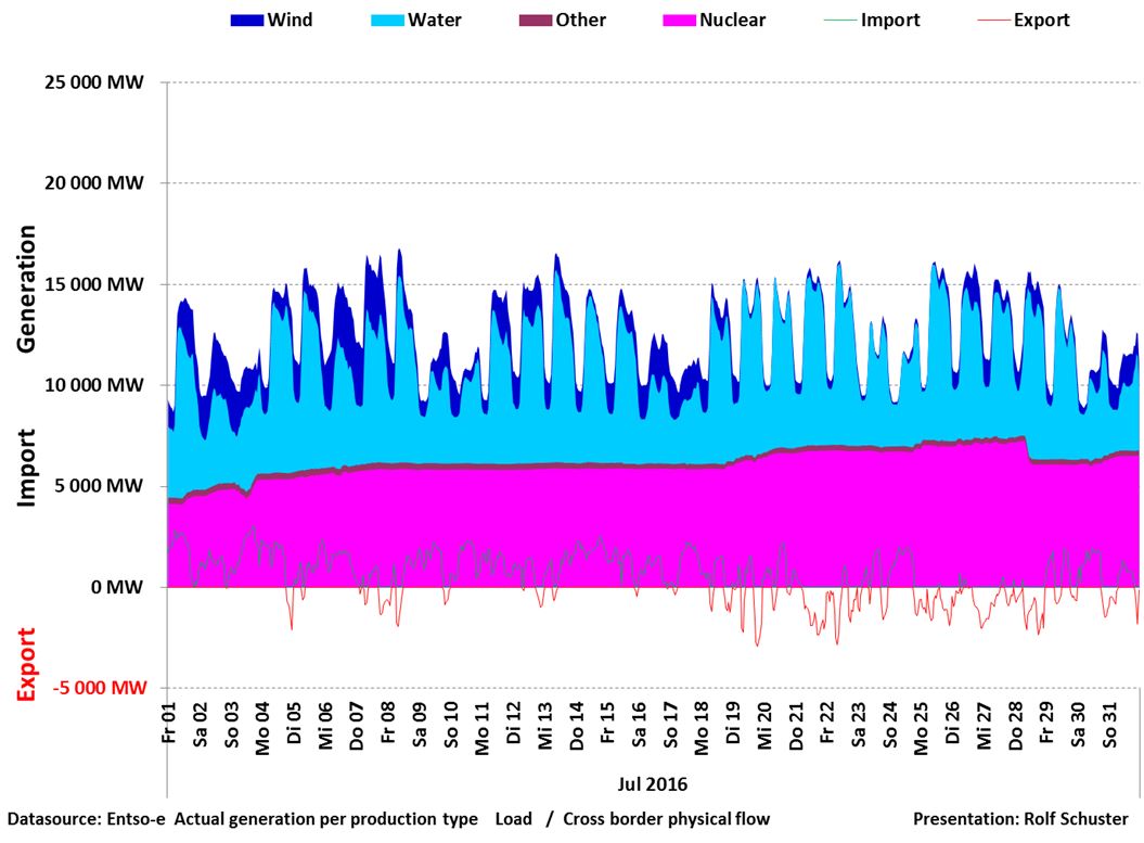 Om vi utgår från att export / import i diagrammet är nettot skulle det vara intressant att analysera vad orsaken till importen är. Saknade vi effekt? Är det resultat av vår roll som transitland för norsk vattenkraftsel? Kanske en funktion av vår roll i nordiska elnätet som leverantör av reglerkraft för att danskarnas vindkraft ska kunna klara dansk effektbalans? Någon som vet?