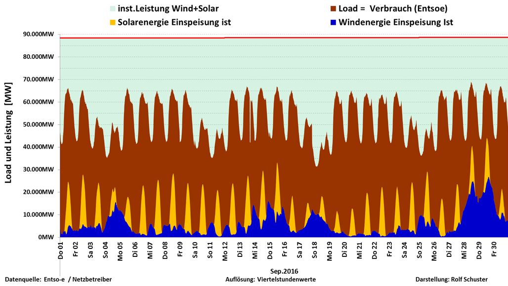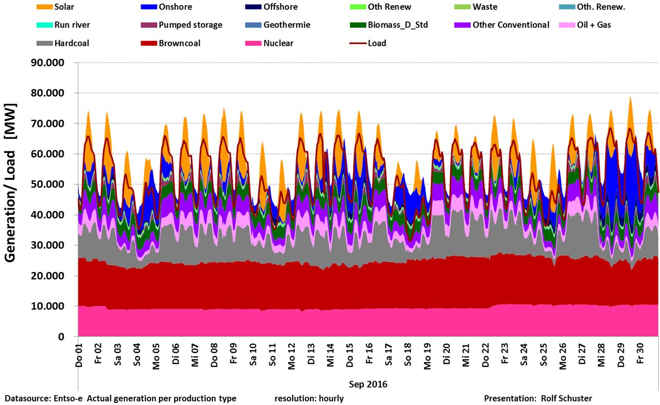 Figur 2. Total produktion med alla energislag redovisade. Med effekt-topparna från solcellerna överskrids behovet, så att export blir nödvändig. Brunkolet dominerar klart.