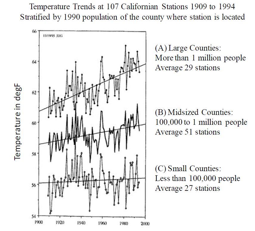 Han grupperade de officiella mätdata efter storleken på respektive ort. För de små orterna noterades en helt obetydlig uppvärmning. (Märk hur högt värdet för 1934 sticker upp ovanför de andra.) Sedan blir uppvärmningen allt större ju större orterna är. Trots hans anmärkningar ville “forskarna” inte lämna sina datorer och titta ut genom fönstren på det egna universitetets mätstation. På 1800-talet hade den föredömligt placerats på en grön äng långt från byggnader, vägar och vattendrag, som kunde påverka dess temperatur. Men på100 år hade hus och vägar byggts allt närmre för att på många håll helt omsluta stationen.