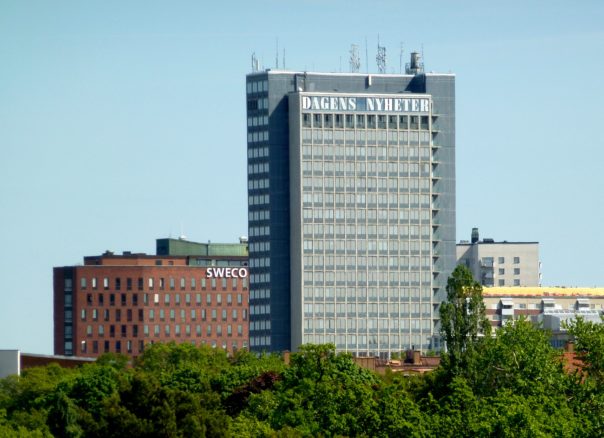 DN:s skyskrapa framför den byggnad som var SvD:s redaktion och nu innehas av SWECO