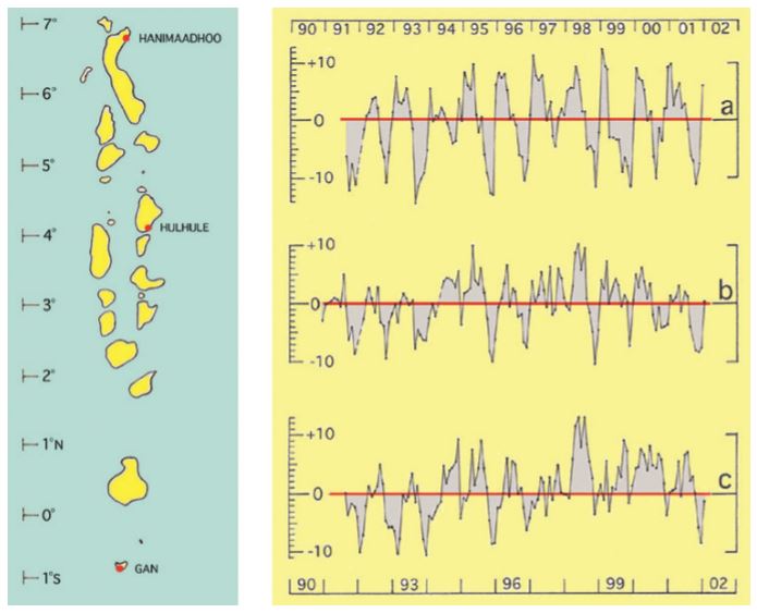 Ögruppen Maldiverna med c:a 20 större atoller ligger i Indiska Oceanen mellan 1 grad sydlig och 7 grader nordlig bredd, skalan längst till vänster. Till höger visas loggar från tidvattenmätare på tre av öarna under åren 1990 - 2001. Till vänster avvikelserna från medelvärdet i millimeter.