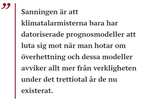 Sanningen är att klimatalarmisterna bara har datoriserade prognosmodeller att luta sig mot när man hotar om överhettning och dessa modeller avviker allt mer från verkligheten under det trettiotal år de nu existerat. En del forskare som arbetar för FN:s expertorgan IPCC medger själva att de är störda av de stora avvikelserna.