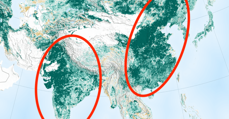 Satellitfoton har under lång tid visat att Jorden blir allt grönare, särskilt markant i Indien och Kina