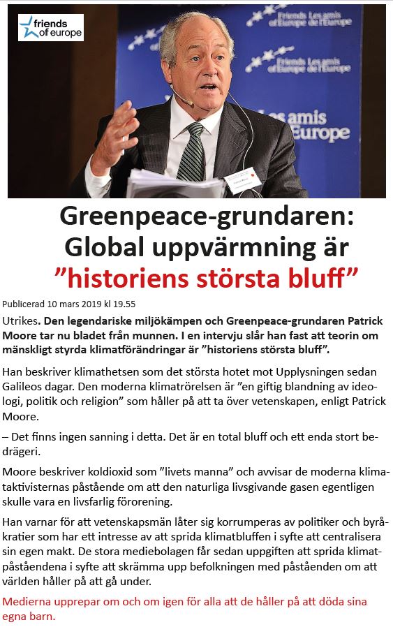 Patrick Moore, som var en av grundarna till Greenpeace, tar bladet från munnen, översättning Fria Tider