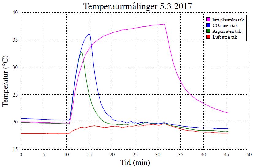 Både CO₂ och argon är tyngre än luft. Argon är den vanligaste “spårgasen” i atmosfären och betraktas inte som en “växthusgas”. Vi ser att dessa gaser ligger kvar i lådorna och värms under c:a 5 minuter. Då blir de lättare, stiger upp ur lådorna och ersätts med luft från omgivningen.