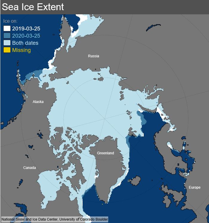 Notera att vit färg visar is som fanns 2019 men inte 2020, därför markeringen i Bottenviken. Den mörkare blå färgen visar is i år där ingen fanns i fjol, se läget runt Spetsbergen.