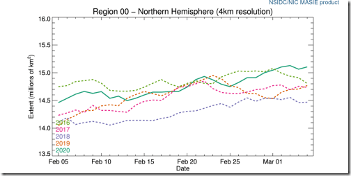 Figur 2. Isens utbredning de fem senaste åren. I år nåddes den maximala utbredningen den 5 mars, grön kurva. Den var då 15,1 miljoner km², större än alla åren sedan 2013.