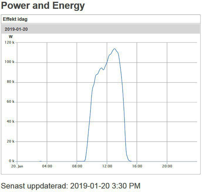 Parkens märkeffekt är en MW, megawatt, d.v.s. 1.000 kW, kilowatt. En av de soligaste dagarna i januari blev maximala effekten 117 kW, d.v.s. 11.7 % av märkeffekten. Innan kl 09:00 och efter kl 15:00 är effekten NOLL.