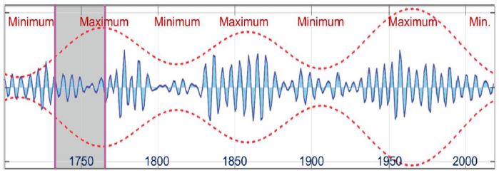 Blått visar halvperioder med längden 5,5 år. Prickat rött visar Gleissbergs 120-åriga dubbla cykler.