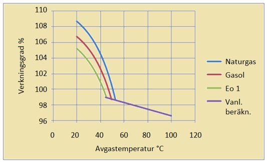 Av hävd räknar vi i ”västvärlden” med undre värmevärdet. Det går aldrig att erhålla de tänkta 100 %:en utan att kondenseringen ”spökar till det”, vilket framgår av nedanstående diagram. Det visar på ett ungefär möjligheterna för bränslena naturgas, gasol (propan 95) och Eo 1, eldningsolja 1.
