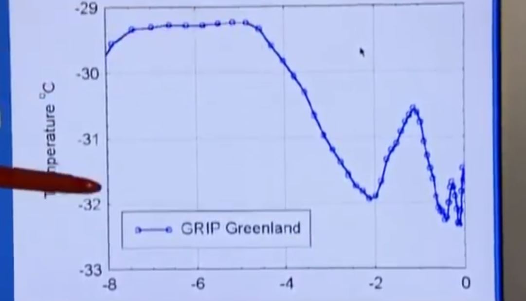 Professor Jørgen Peder Steffensen har lett ett forskarteam, som studerat borrkärnor från Grönlands kilometertjocka istäcke. De har med god noggrannhet kunnat fastställa vilken temperaturen varit då snön fallit. De senaste 400 åren varade den Lilla Istiden fram till c:a 1870, då den lägsta temperaturen noterades. För tiden mellan sju och fem tusen år sedan var temperaturen 2½ grad högre och föll därefter till ett minimum vid Romartiden och steg en hel grad fram till den Medeltida värmeperioden.