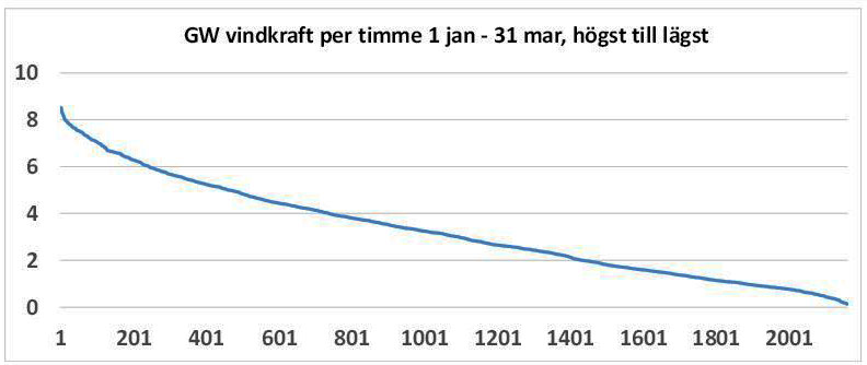Figur 2. Vindkraftens effekt, GW gigawatt, under första kvartalet