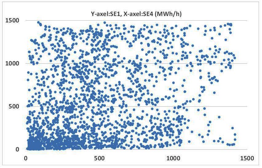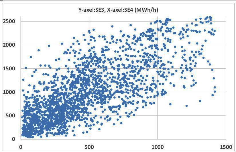 SE4 och SE3 ligger intill varandra och inte förvånande finns en viss korrelation (svag, 0,74) mellan områdena. D v s blåser det lite i det ena av områdena så blåser det sannolikt lite i det andra området också.