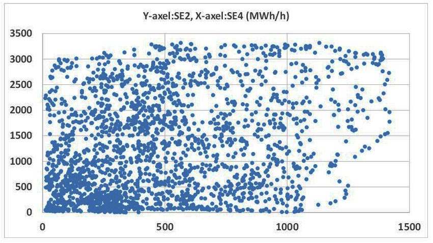 Punkter högt upp till höger representerar timmar med hög produktion i båda el-områdena.
