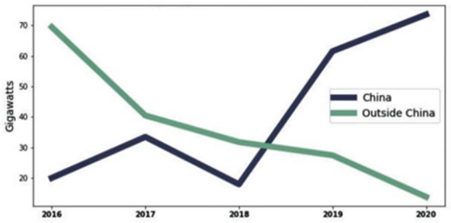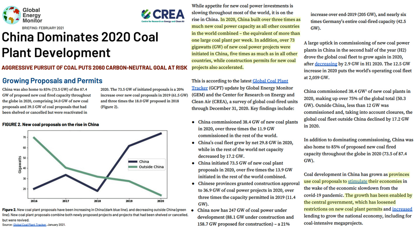 Under 2020 inledde Kina planeringen av 73,5 GW ny kolkraft, vilket är fem gånger vad som planerades i resten av världen.