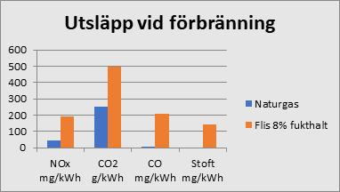 Figur 2. Avgasernas renhet för naturgas och träflis med 8 % fukthalt