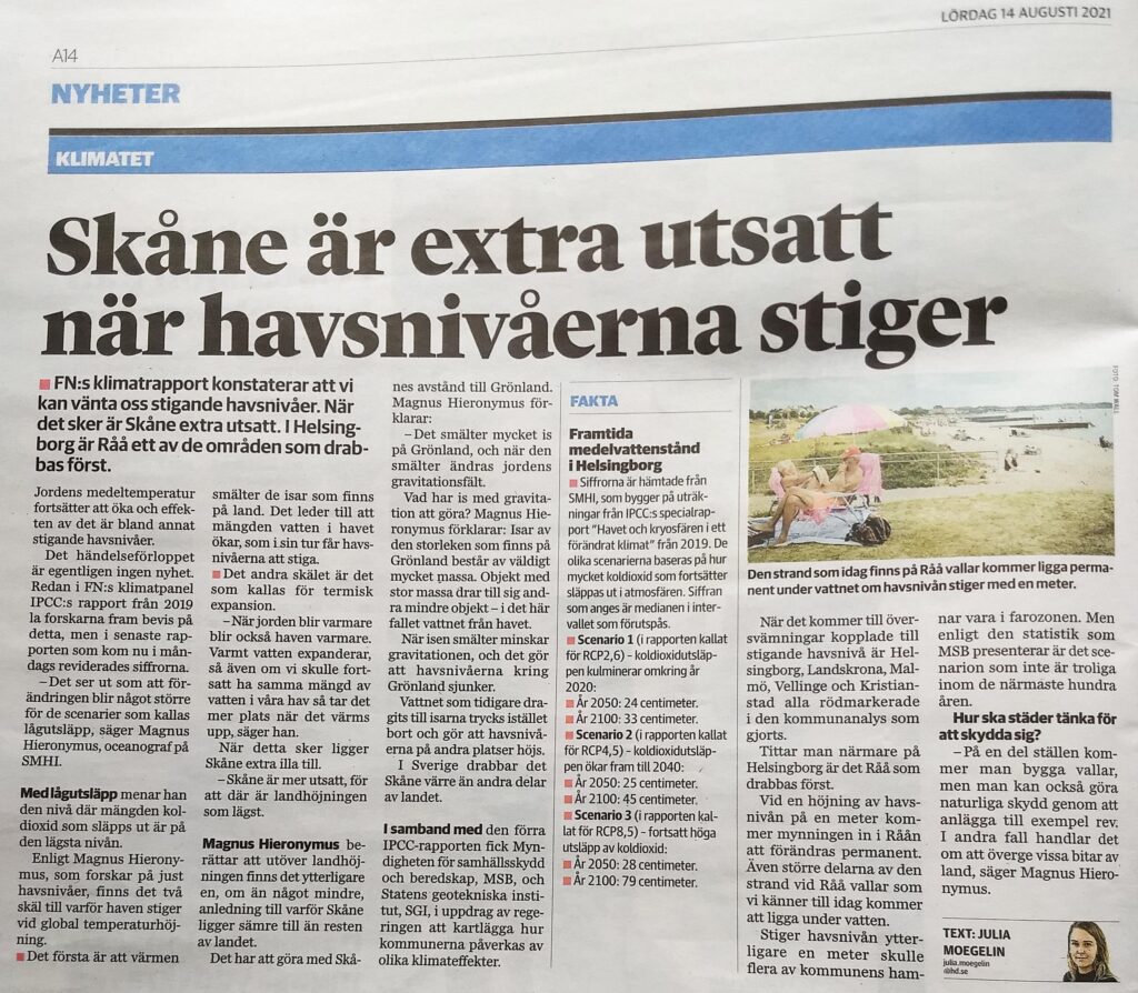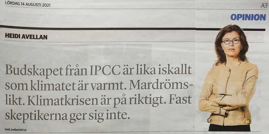 Heidi Avellan ansvarar för ledarsidan på HD/Sydsvenskan det vill säga dess politiska ställningstaganden. Den 14/8 ägnar hon hela sidan åt IPCC och klimatet, men visar att hon är medveten om kritiken från olika håll,. bl.a. från KLIMATSANS. Vi känner oss hedrade av sådan uppmärksamhet.