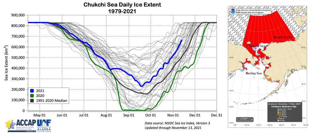 Därför har 15 fartyg fastnat i isen. Dess utbredning är nu nästan 300.000 km² större än i fjol. Den minsta utbredningen i september var över 200.000 km², vilket betyder att fjolårsis fanns kvar i sundet vid Wrangels Ö, så att där nu finns is som är mer än 2 meter tjock.