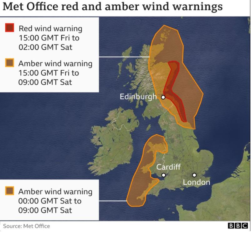 Det har orsakat två dödsfall av omkullblåsta träd enligt BBC. I Northumberland och Skottland blev 80.000 utan ström. Viss tågtrafik har ställts in.