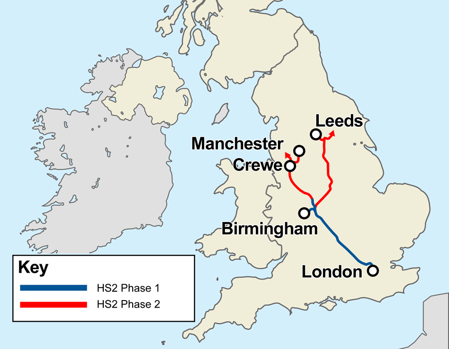 Nu pågår bygget av höghastighetsbanan HS2, High Speed 2, från London till UK:s andra stad, Birmingham, med 1,14 miljoner invånare i första etappen, och till dess femte stad Manchester med 0,55 miljoner invånare i en andra etapp. Total längd blir 555 km.