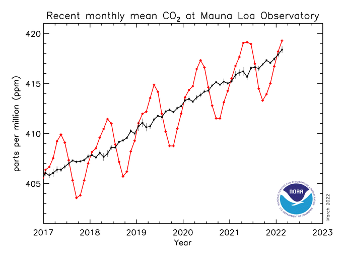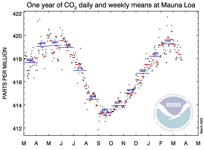Det årliga toppvärdet inträffade i fjol i maj liksom de flesta åren. Det märkliga med dessa data är att årets topp tycks vara passerad redan i februari. Data därefter indikerar att en sänkning är på gång. Om denna bekräftas i kommande mätningar betyder det att halten i luften minskar trots att “människans” utsläpp nu är högre än någonsin.