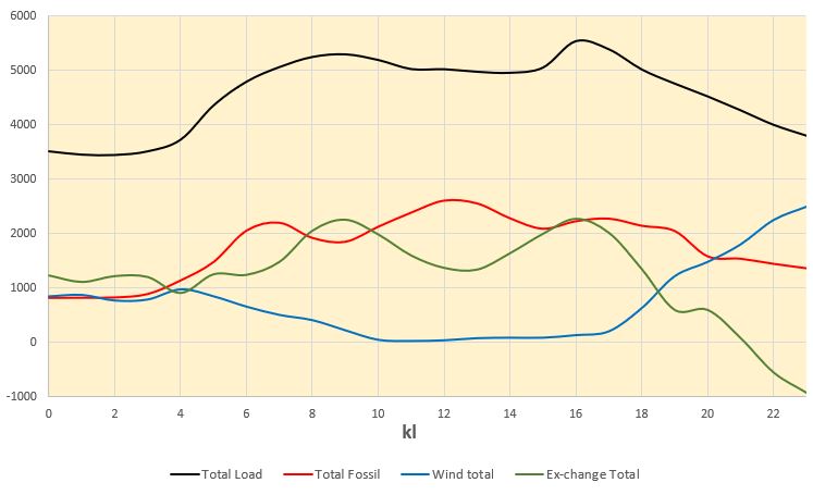 Notera att kl 12 exporterade Danmark 334 MW till “kontinenten”, d.v.s. Tyskland, och importerade samtidigt 1.713 MW från “Norden”, d.v.s. Norge.