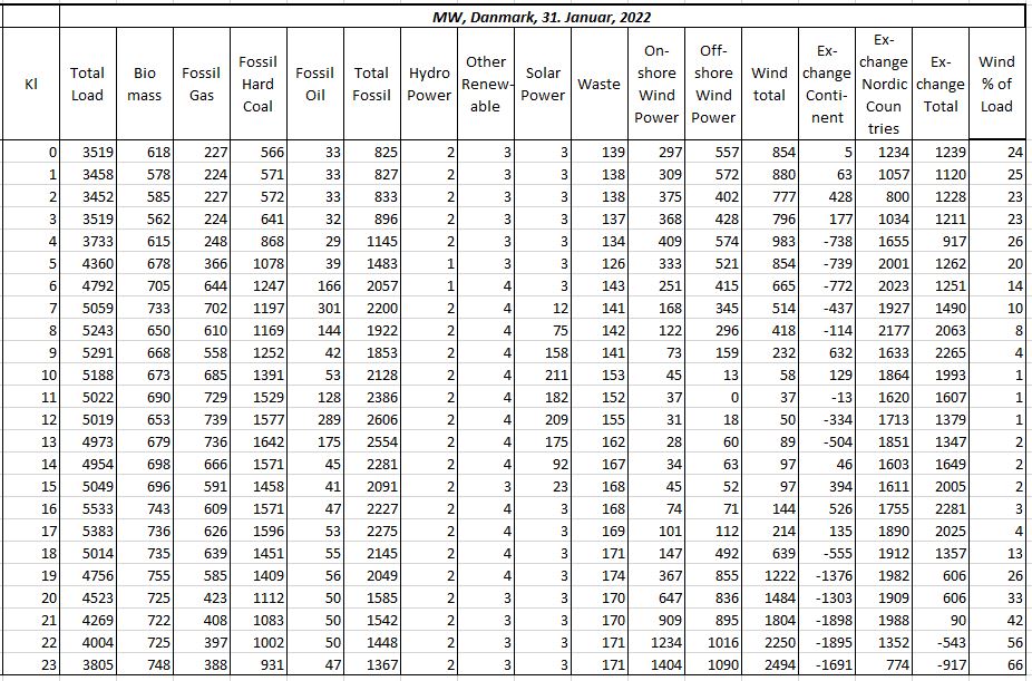Danmark får vanligen betydande mängder el från Sverige, men i posten “Svensk el januari 2022” ser vi att även Sverige importerade el den 31/1. Effekten från Tysklands vindkraft på haven öster och väster om Danmark var också ovanligt låg. När det inte blåser i Danmark, blåser det dåligt också i grannskapet.