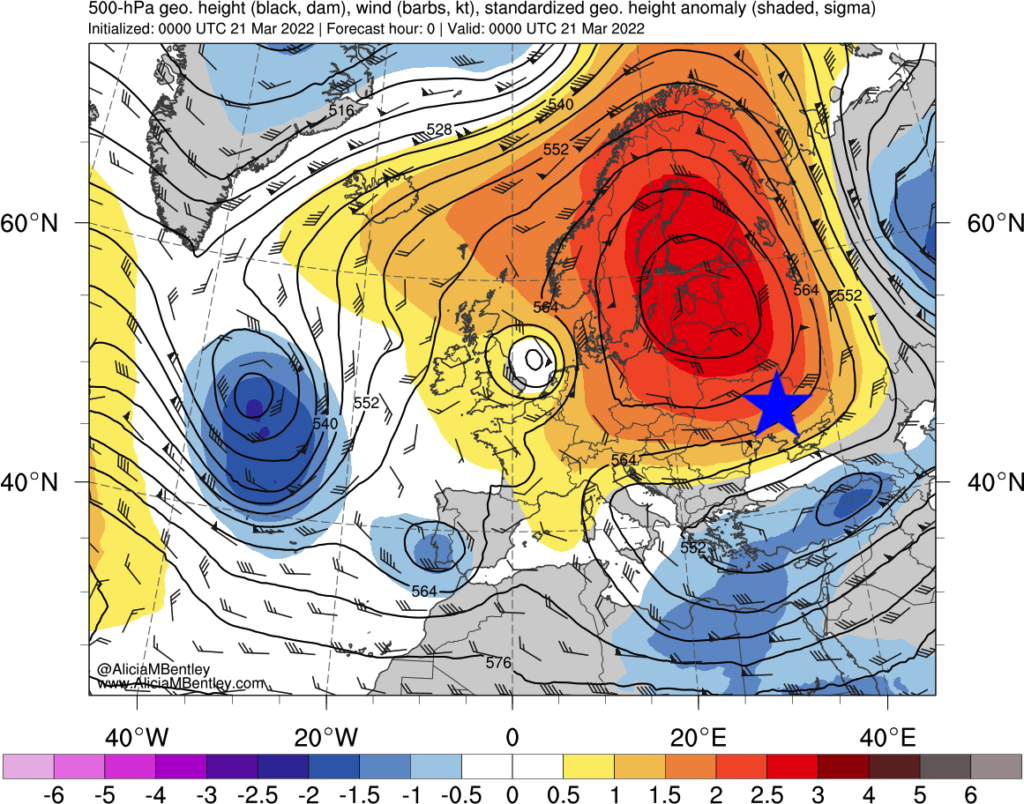 Rött indikerar högre än normalt tryck, vilket ger klar himmel och uppvärmning över Ukraina, som visas med en blå stjärna.