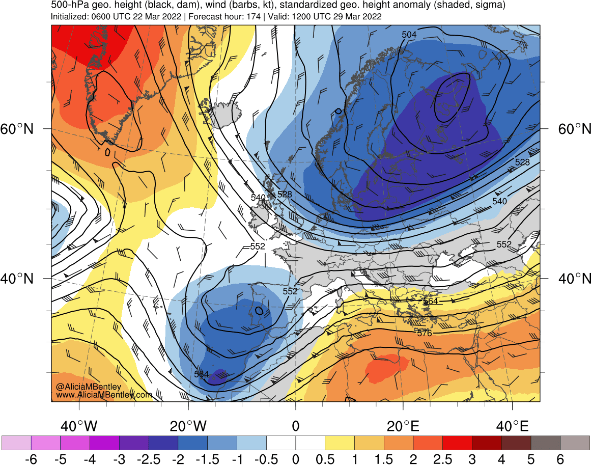 Figur 2. Karta för nivån 500 hPa (cirka 6.000 meter) 21/3 med färger för anomalin