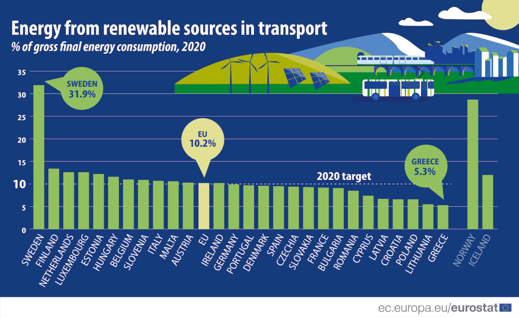Eurostats uppgifter visar att den genomsnittliga andelen förnybar energi inom transporter ökade från 1,6 % 2004 till 10,2 % 2020, vilket ligger 0,2 procentenheter (pp) över målnivån. Bland medlemsstaterna överträffade 12 målet. Sverige var klart ledande med 31,9 %, följt av Finland (13,4 %), Nederländerna och Luxemburg (båda 12,6 %).