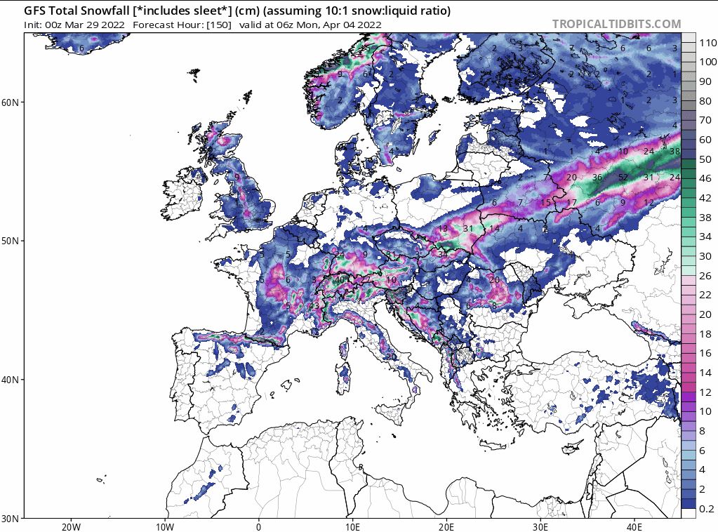 Figur 2. Prognos för snöfall i Europa den 4:e april