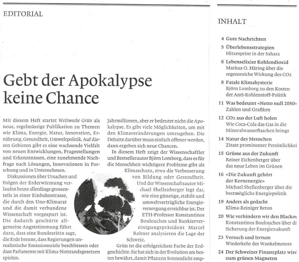 Med detta häfte startar Weltwoche Grün som en ny regelmässig publikation med teman som Klimat, Energi, Natur, Innovation, Livsmedel, Hälsa. Miljöpolitik. På dessa områden finns ett växande flertal av nya utvecklingar, frågeställningar och rön, en tilltagande efterfrågan på lösningar, innovationer i forskning och i företag.