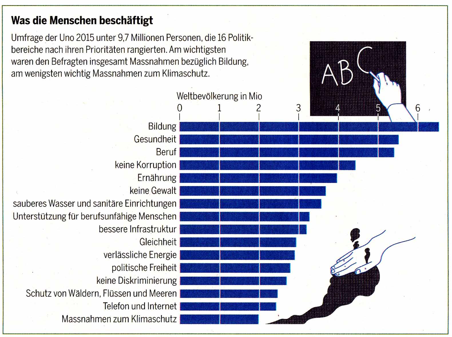 De rangordnade 16 politikområden efter angelägenhet. “Klimatskydd” hamnade klart sist. Områdena var följande: