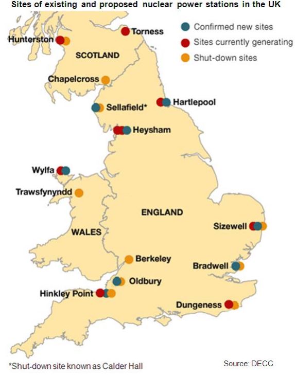 Figur 3. Kärnkraftverk i UK, planerade nya, blått, i drift, rött och nedlagda, gult