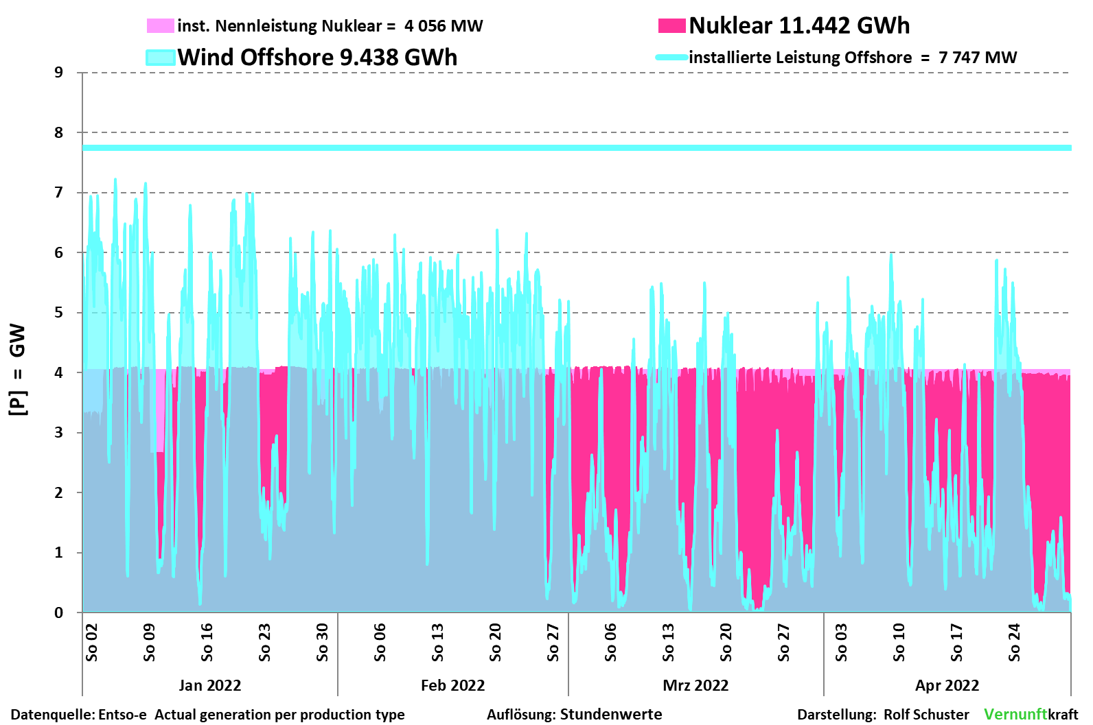 Figur 2. Effekten under 1:a kvartalet från Tysklands kärnkraft och OffShore vindkraft