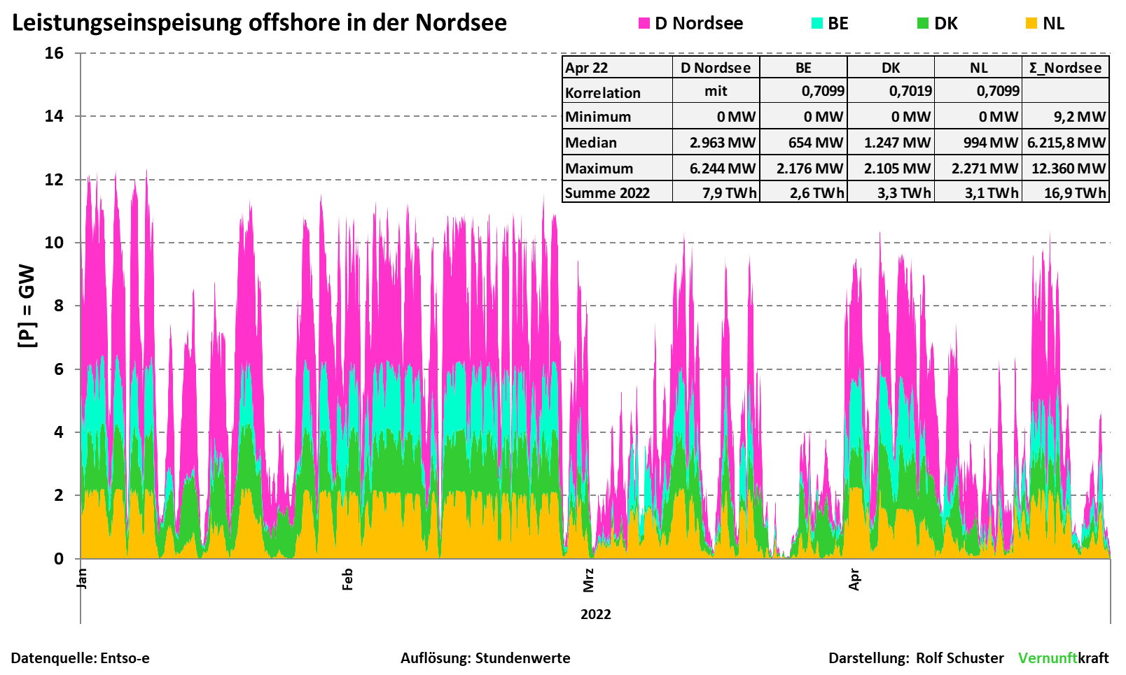 Figur 1. Levererad effekt under 1:a kvartalet från alla länders vindkraftverk på Nordsjön