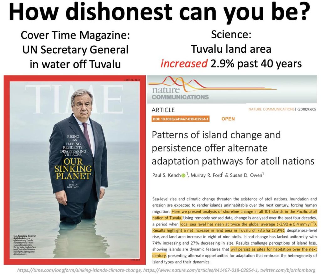 På förstasidan av TIME 24 juni 2019 lånar sig generalsekreteraren António Guterres till ett jippo med avsikt att i läsarna inpränta faran med havens stigande nivå. Den faran finns bara i IPCC:s “klimatmodeller” som baseras på datorsimuleringar med så många gissade in-data, att de är lika bra som en enda gissning. Havet stiger bara med 1 à 2 mm per år, en takt som korallerna matchar, så att öarna faktiskt växer i area.