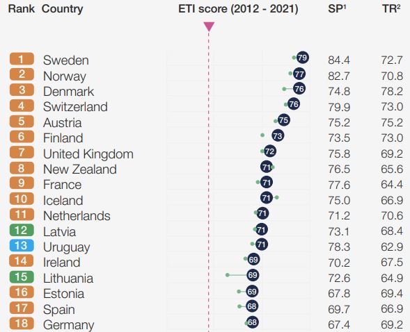 Figur 2. Början på listan över WEF:s framräknade ETI för alla länder