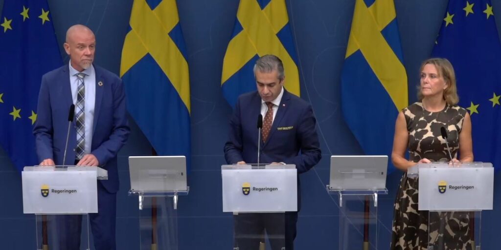 Robert Andrén, GD Energimyndigheten, Khashayar Farmanbar, energiminister, och Lotta Medelius-Bredhe, GD Svenska Kraftnät, vid en pressträff 2022-09-08