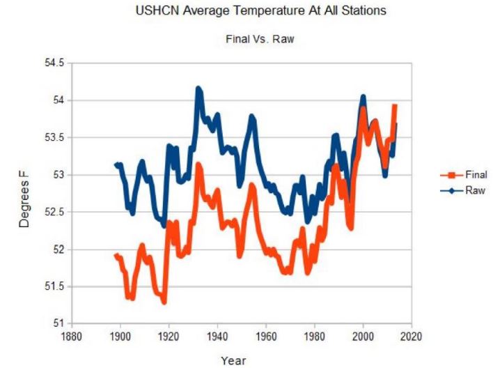 Figur 4. Alla USA:s väderstationers råa data visar att den högsta medel-temperaturen nåddes på 30-talet, blå kurva, men deras råa data har “justerats”, orange kurva, så att de varmaste åren inträffat i sen tid.