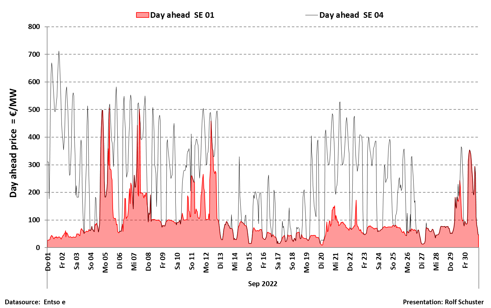 Figur 5. Årets spotpris i el-område SE 01 och SE 04