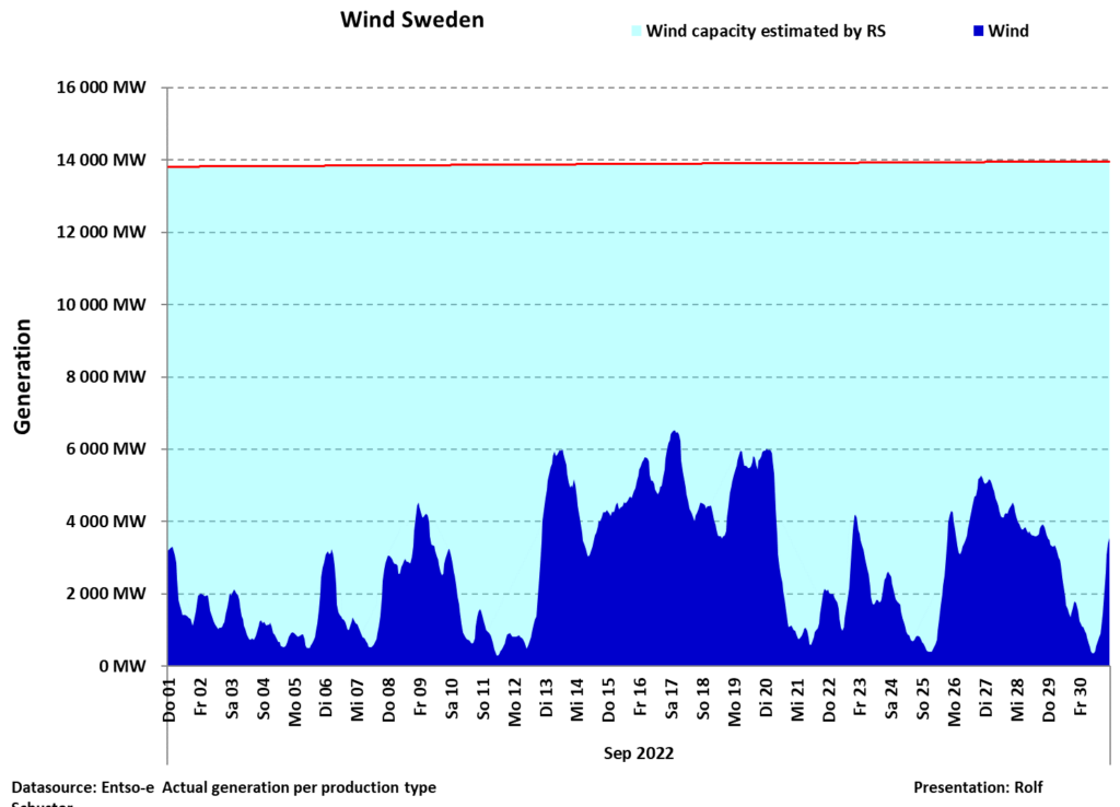 Vindarna var svaga. Även denna månad når effekt-topparna inte ens halva installerade kapaciteten, men den jämna blåsten i mitten av månaden förbättrar totala produktionen något jämfört med föregående månad.