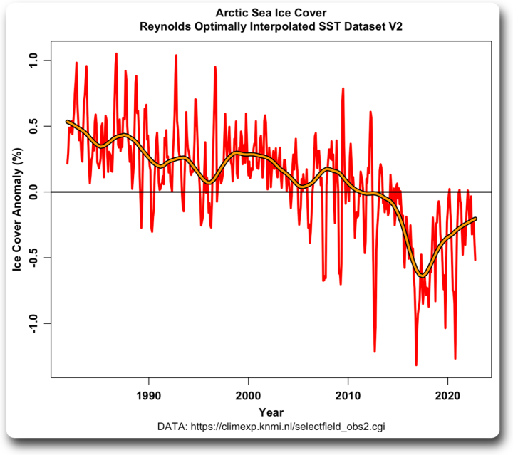 Sedan omkring 1990 har man ständigt pratat om hur människan utsläpp av CO₂ minskar mängden arktisk havsis. När den började sjunka väldigt snabbt runt 2015, talades det om att vi hade passerat en “tipping point” från vilken den arktiska isen aldrig skulle återhämta sig. Och under hela denna tid florerade förutsägelser om ett “isfritt arktiskt hav”.