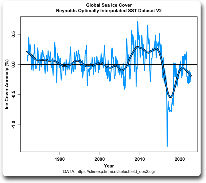 Figur 3. Den globala utbredningen av havsis, anomalin från medelvärdet 1991 - 2020 enligt KNMI
