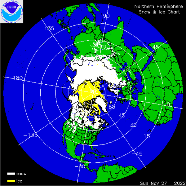 Kartan visar läget den 27:e november. Snön täcker 3/4 av Skandinavien, delar av Östeuropa nästan ner till Svarta Havet, hela Sibirien och de nordligaste delarna av Kazakstan, Mongoliet och Kina. Det gäller även det mesta av Kanada och några USA-stater längs Klippiga Bergen.